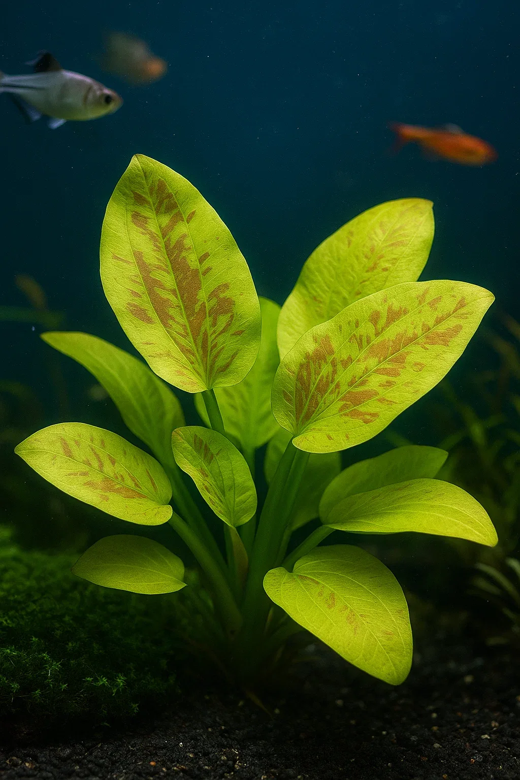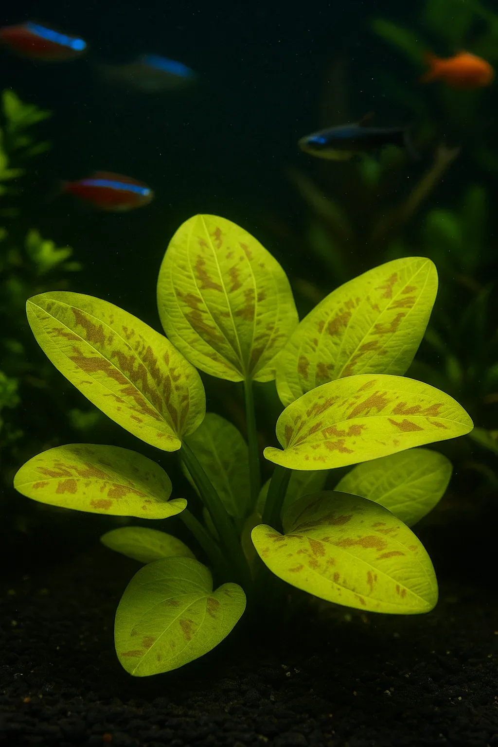 Эхинодорус желтое солнце чувствителен к мягкой воде, в которой его листья могут повреждаться по краям.