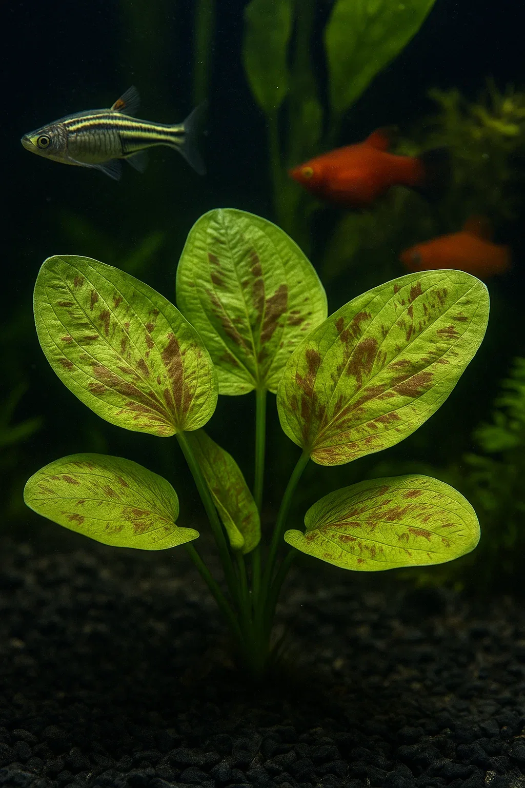 Описание: Эхинодорус желтое солнце — эффектное аквариумное растение с яркими жёлтыми листьями, которое выделяется среди прочих аквариумных растений. Листья на черешках длиной 10-15 см могут достигать 15 см в длину и 10 см в ширину. Молодые листья обладают зелёно-желтым оттенком с бордовым крапом и светло-красными жилками, постепенно становясь зелёными с возрастом. Эхинодорус желтое солнце отлично подходит для акцентирования внимания в аквариуме, особенно в сочетании с зелёной и красной растительностью.