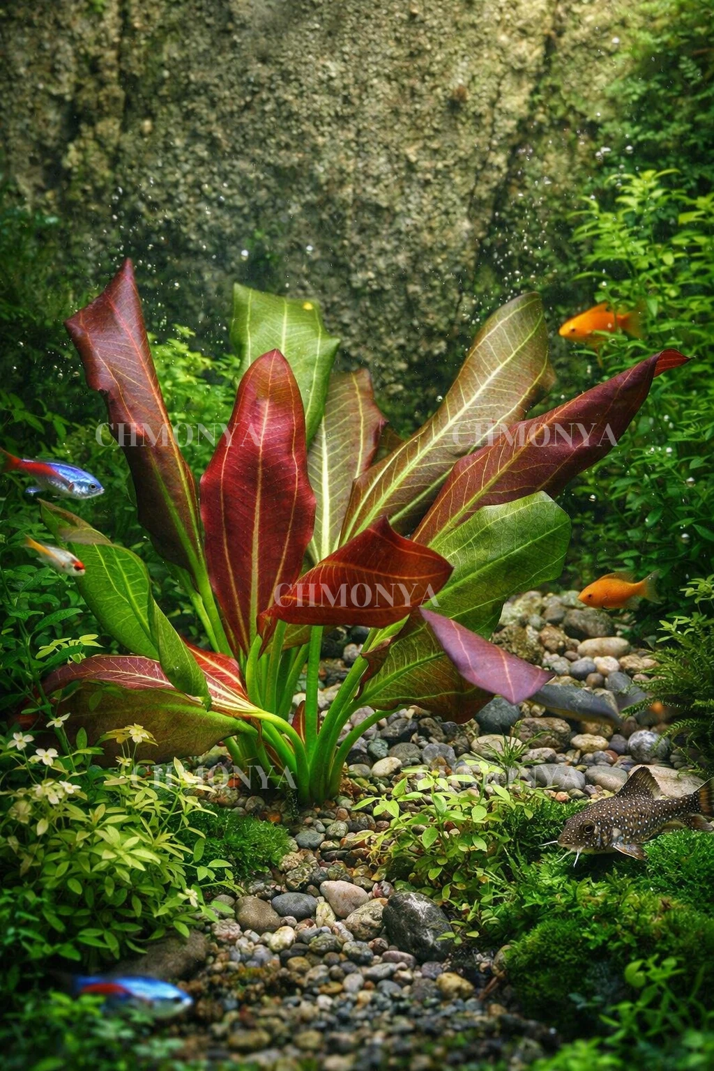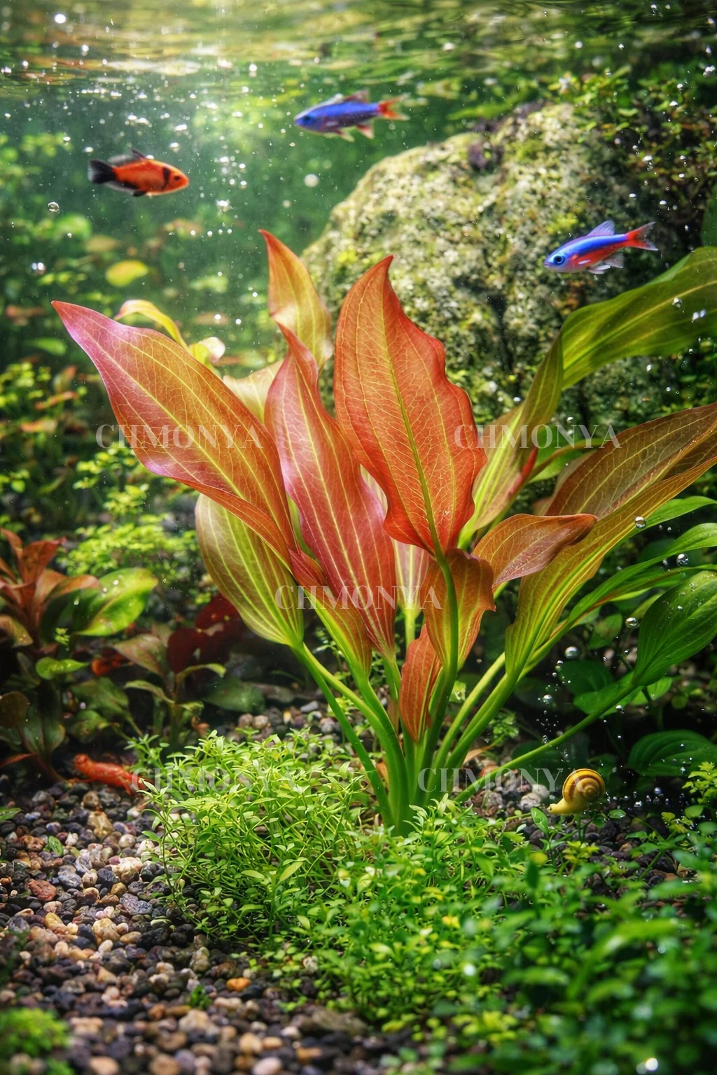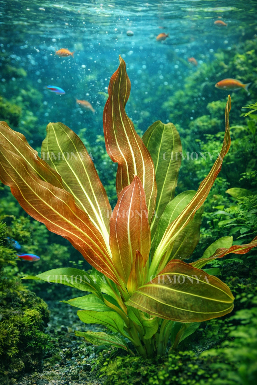 Этот эхинодорус может стать центральным элементом композиции в аквариуме, особенно если его посадить на заднем плане, где он создаст красивый и яркий контраст с другими растениями.
