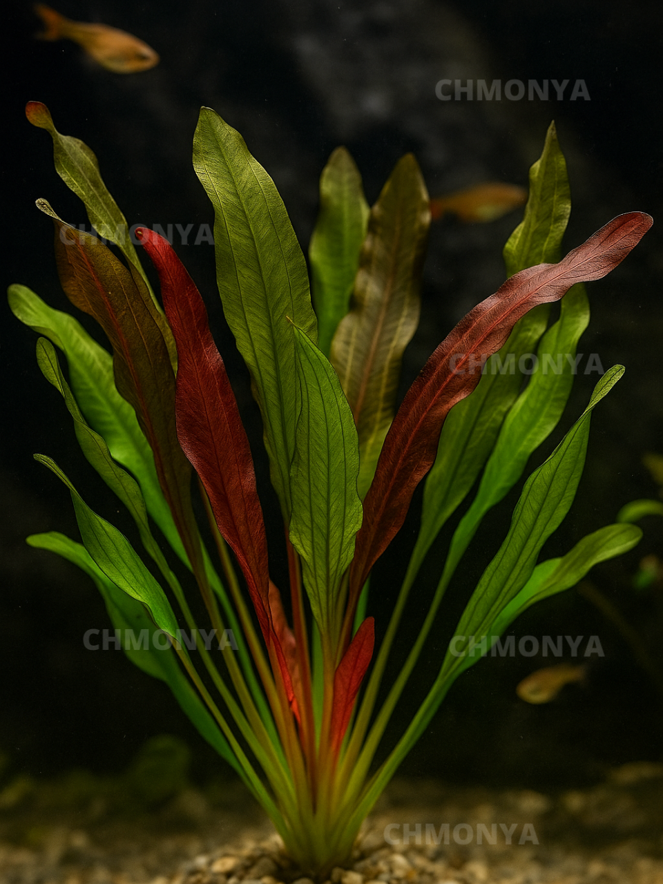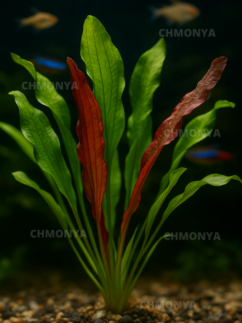 Echinodorus 'Red Devil' — это яркая и декоративная аквариумная форма эхинодоруса, отличающаяся красно-зелеными листьями и необычным внешним видом. Это крупное растение, образующее плотную розетку с листьями, которые могут достигать до 50 см в длину. Листья растения окрашены в темно-зеленые оттенки с красными или коричневыми оттенками, что придает ему яркий и привлекательный вид.